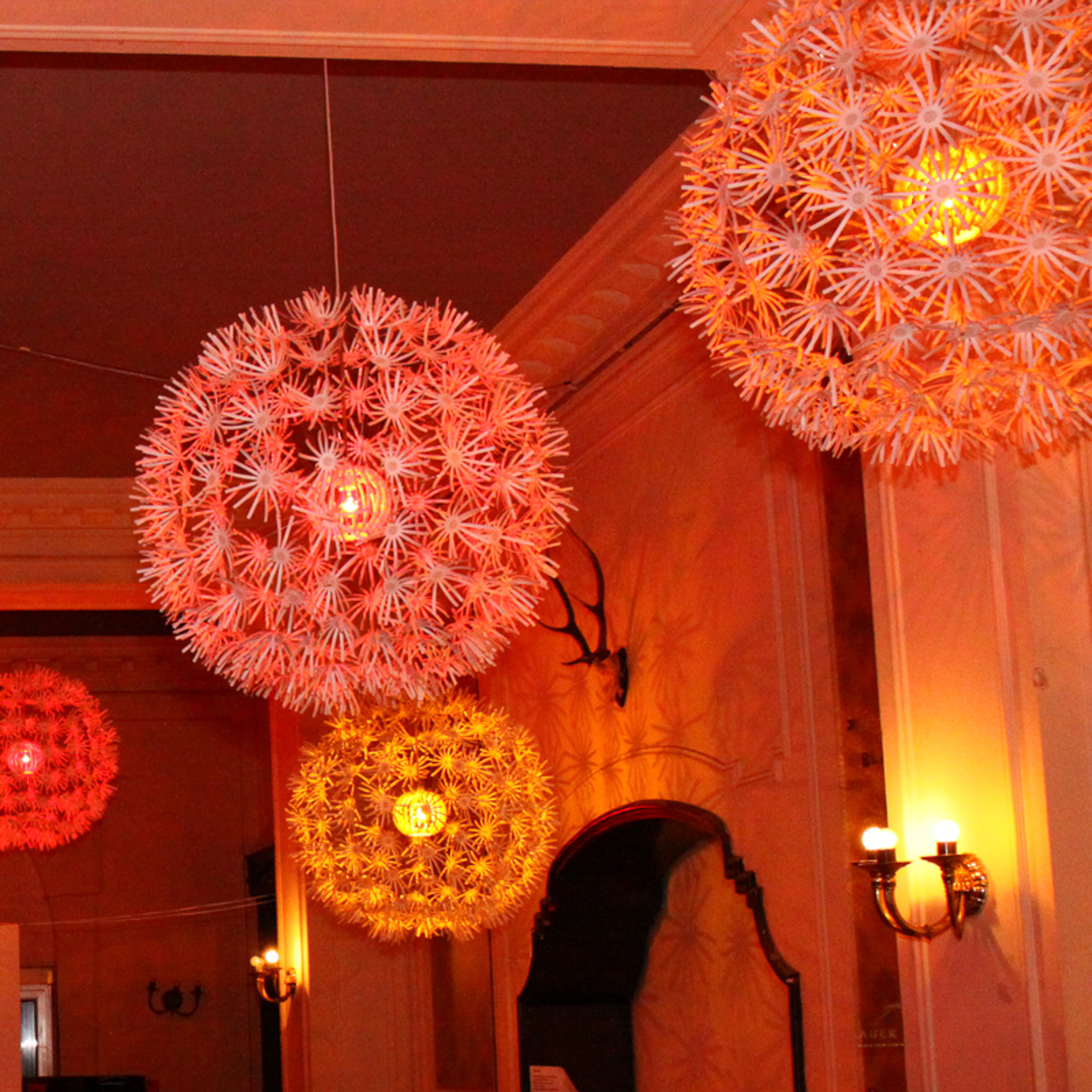 Beschreibung:leuchtende Pusteblumen als Hängedekoration, Blütendurchmesser 1,00m, bestückbar mit farbigen Lampen E27
