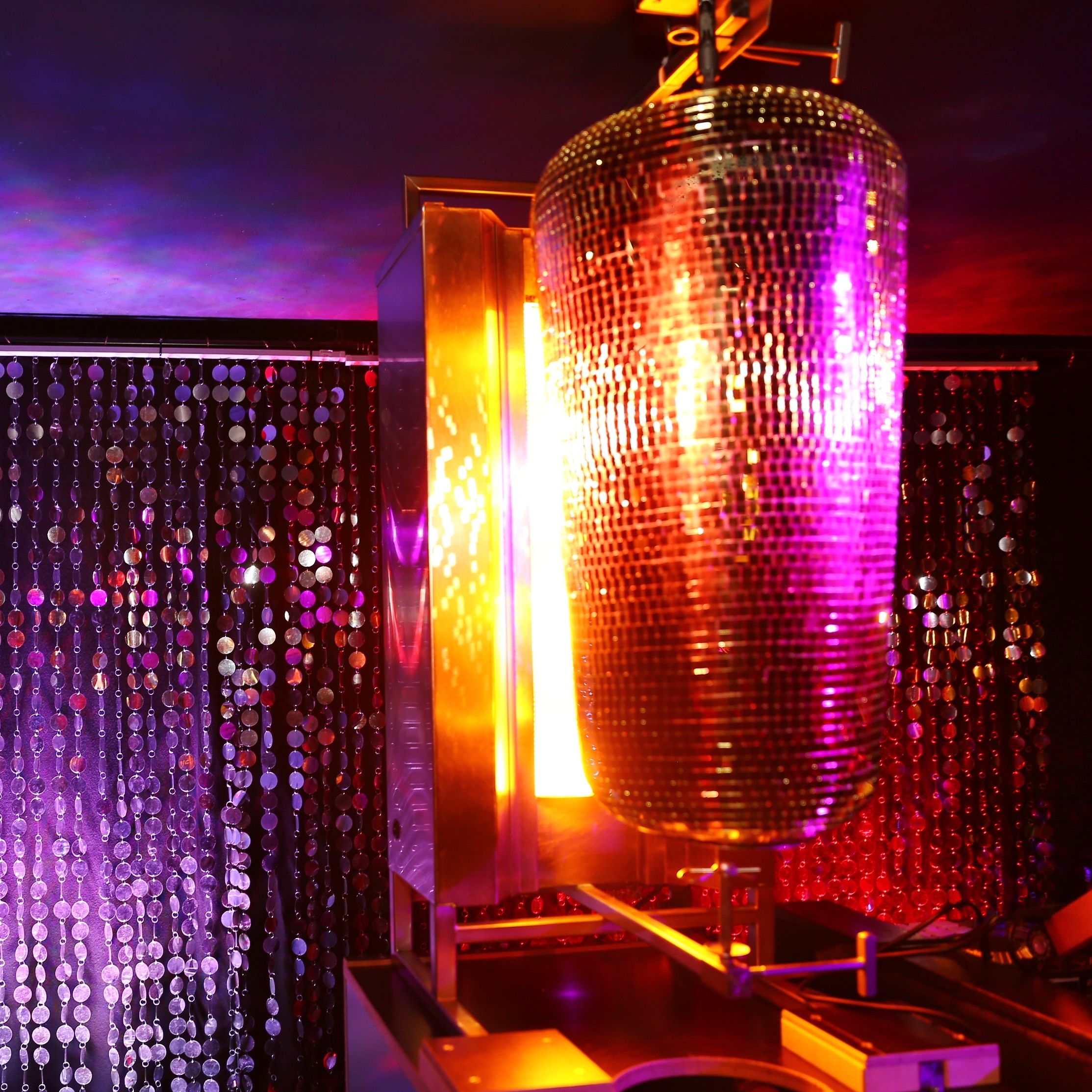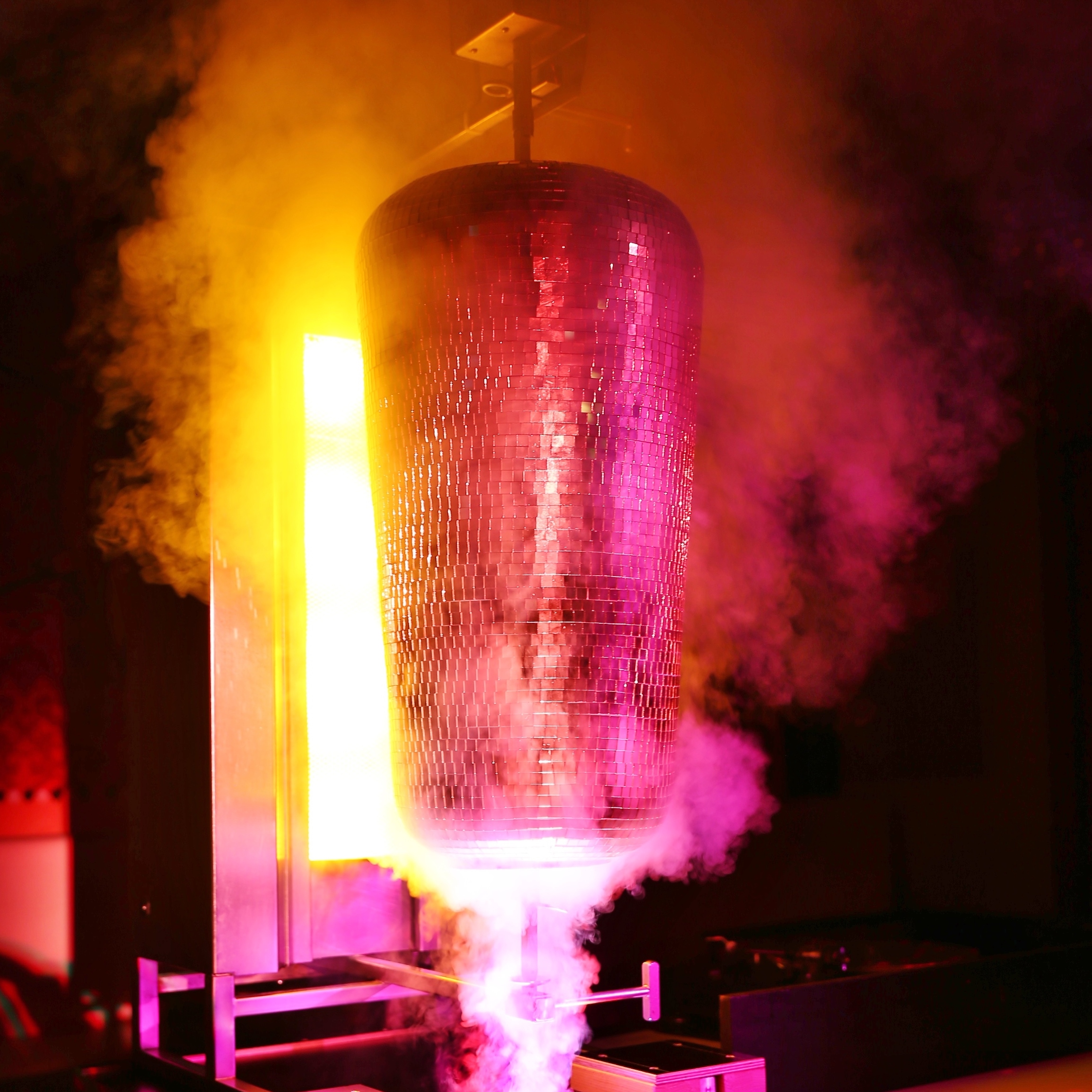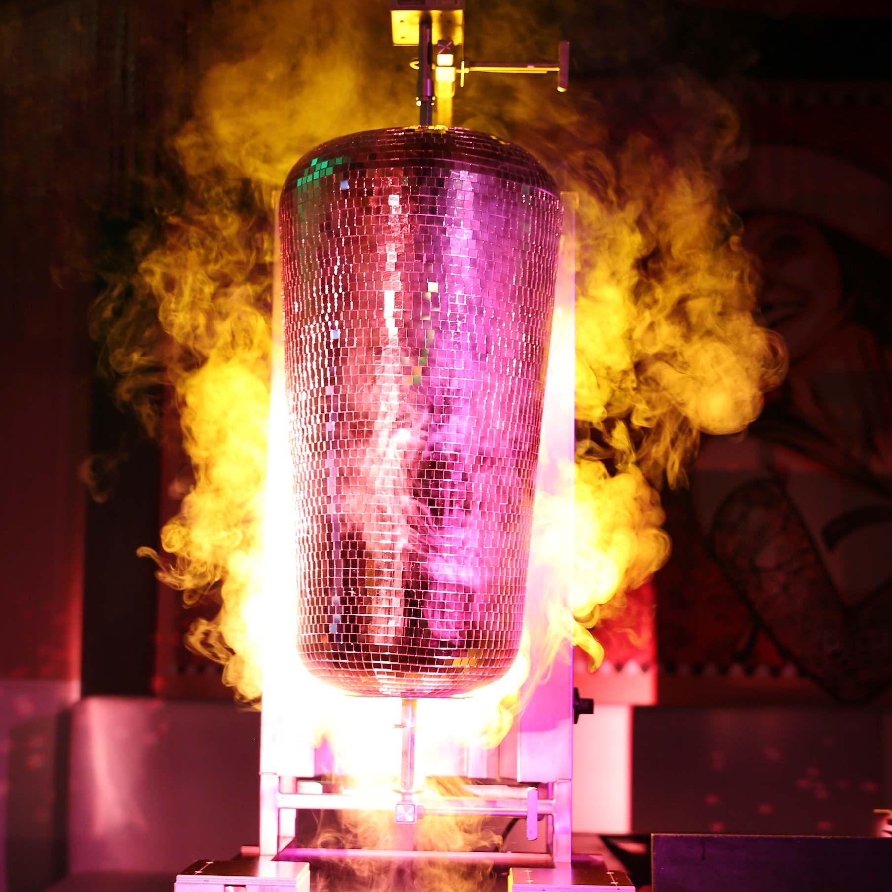 Beschreibung:drehender Disko Döner für internationales Flair und Diskospass. Mit integrierter Vertikalnebelmaschine & Fernbedienung