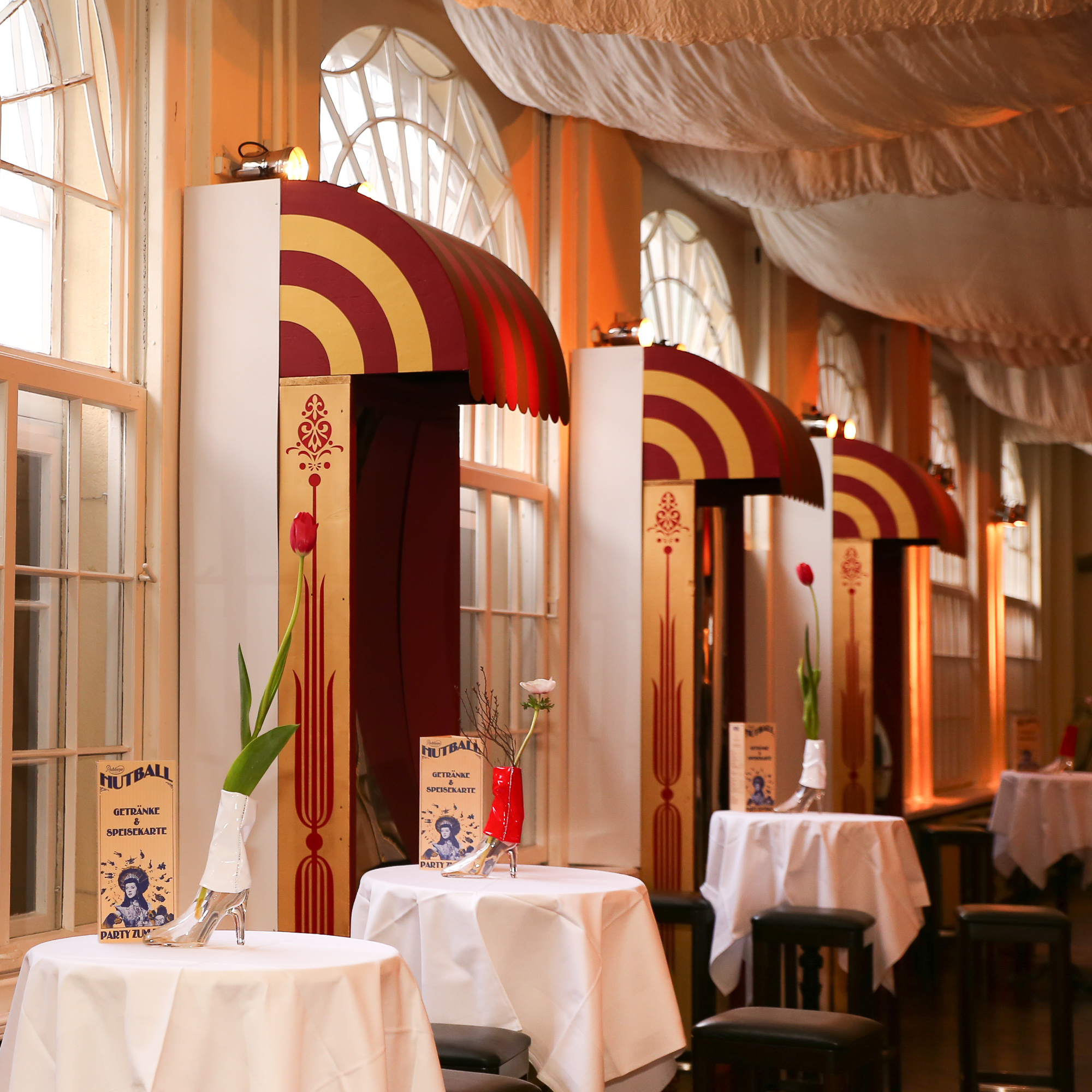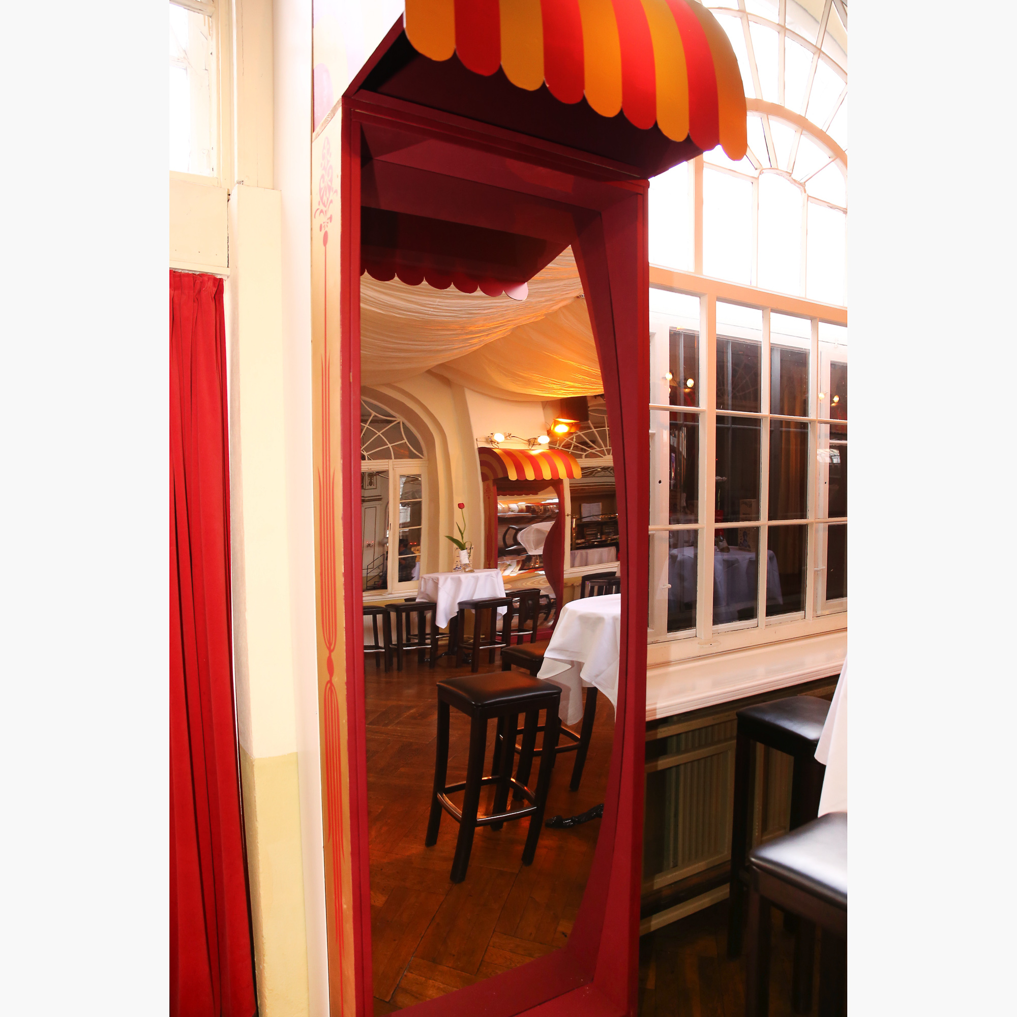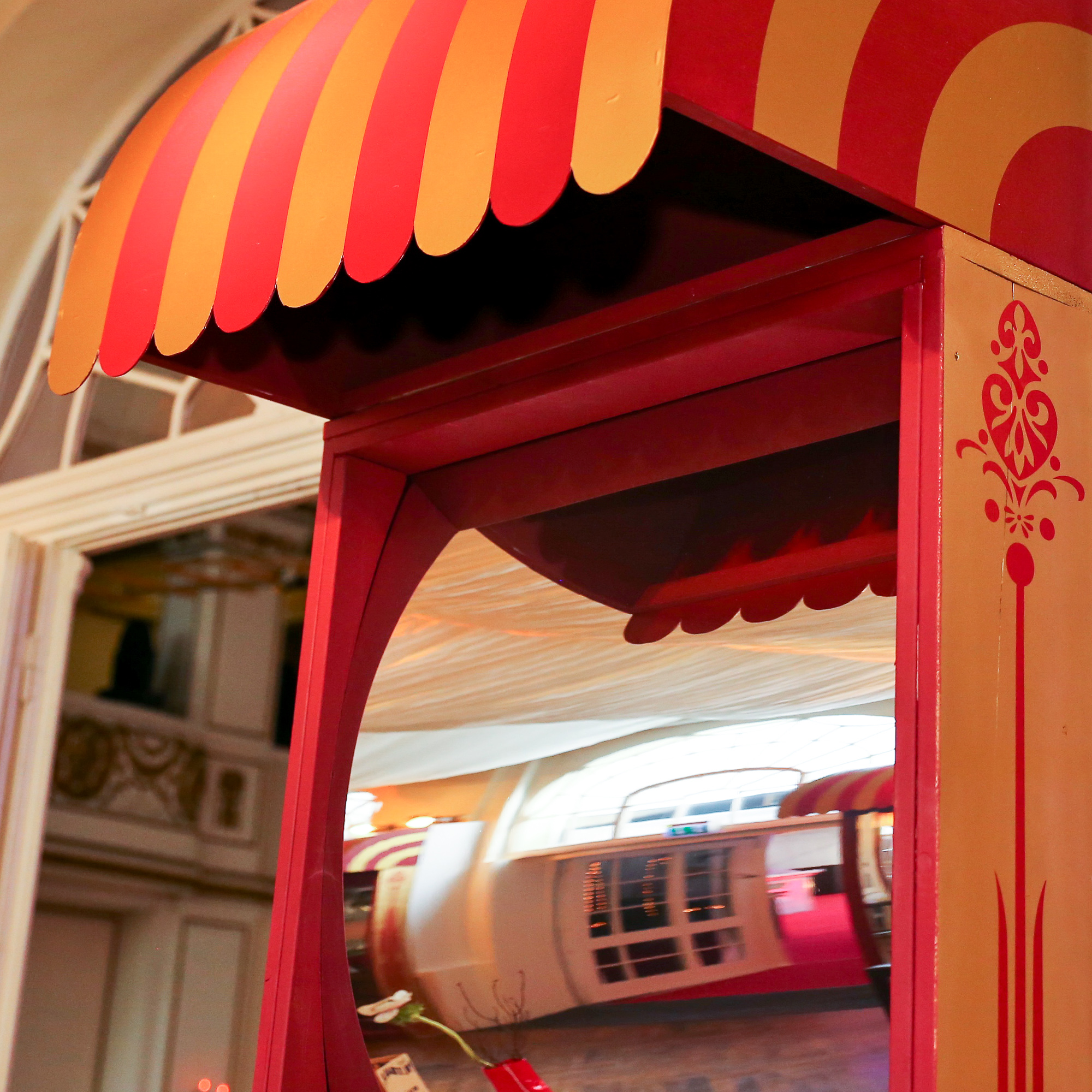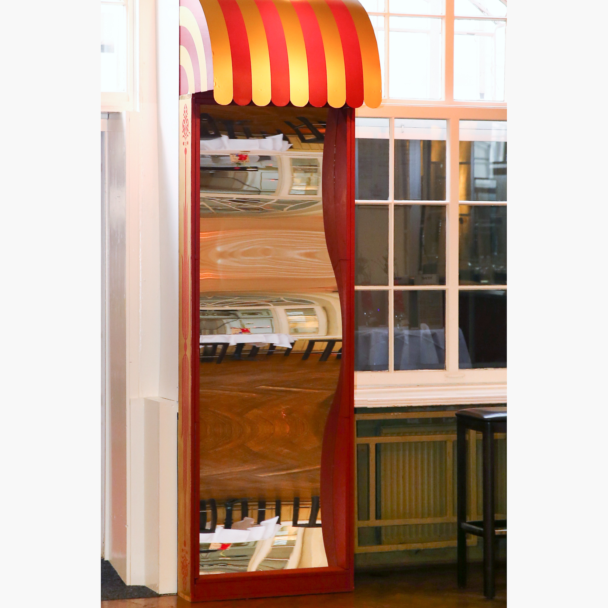Beschreibung:Eventmodul bestehend aus: 8 dekorativen Zerrspiegeln mit 4 unterschiedlichen Wölbungen, Standfüße und 10 bordeauxfarbene Sichtschutzwänden
