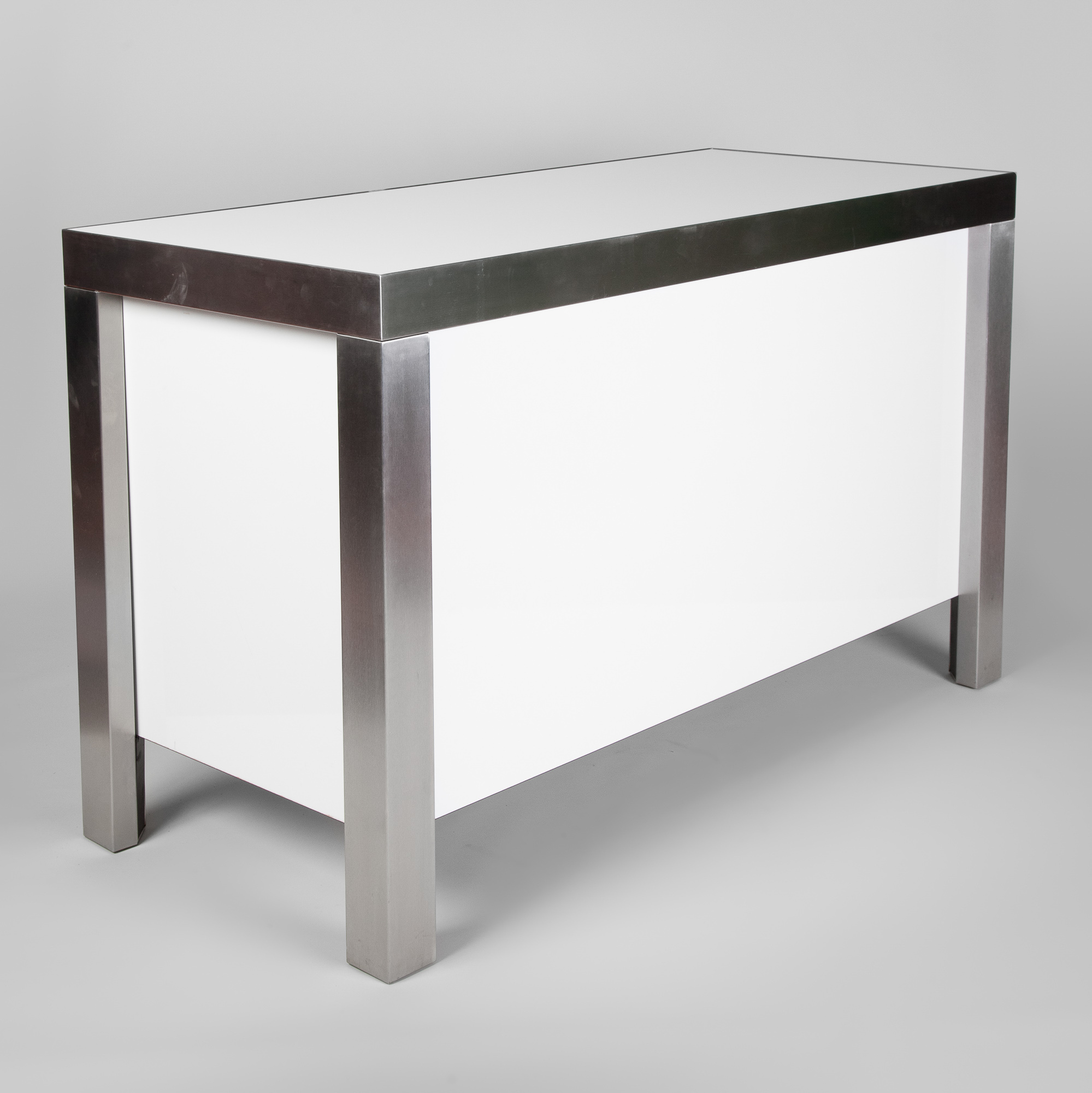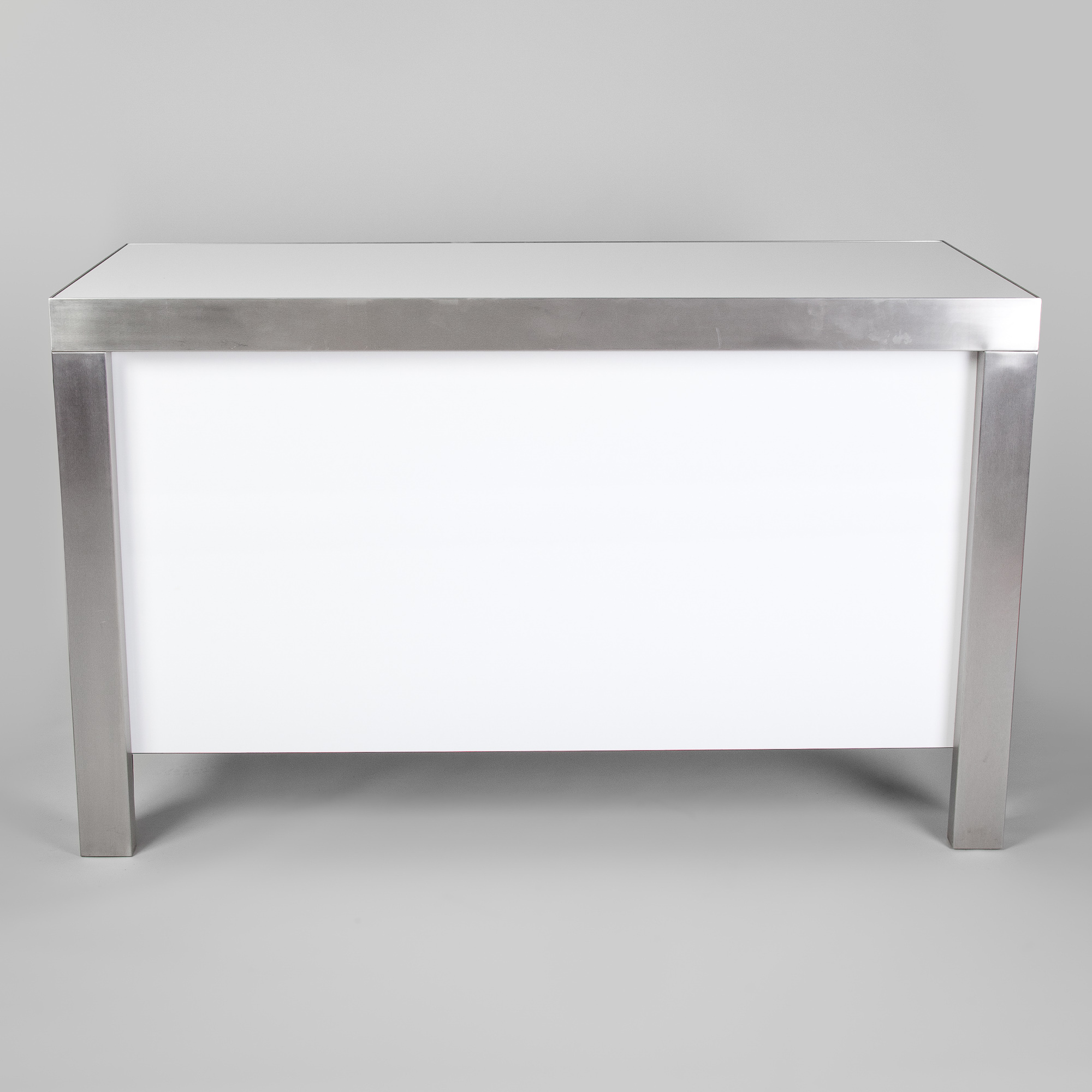 HxBxT: 1,10x1,80x0,80m; Platte Fb. nach Wahl; Rahmen Edelstahl; Front u. Seiten weiß inkl. Ablage