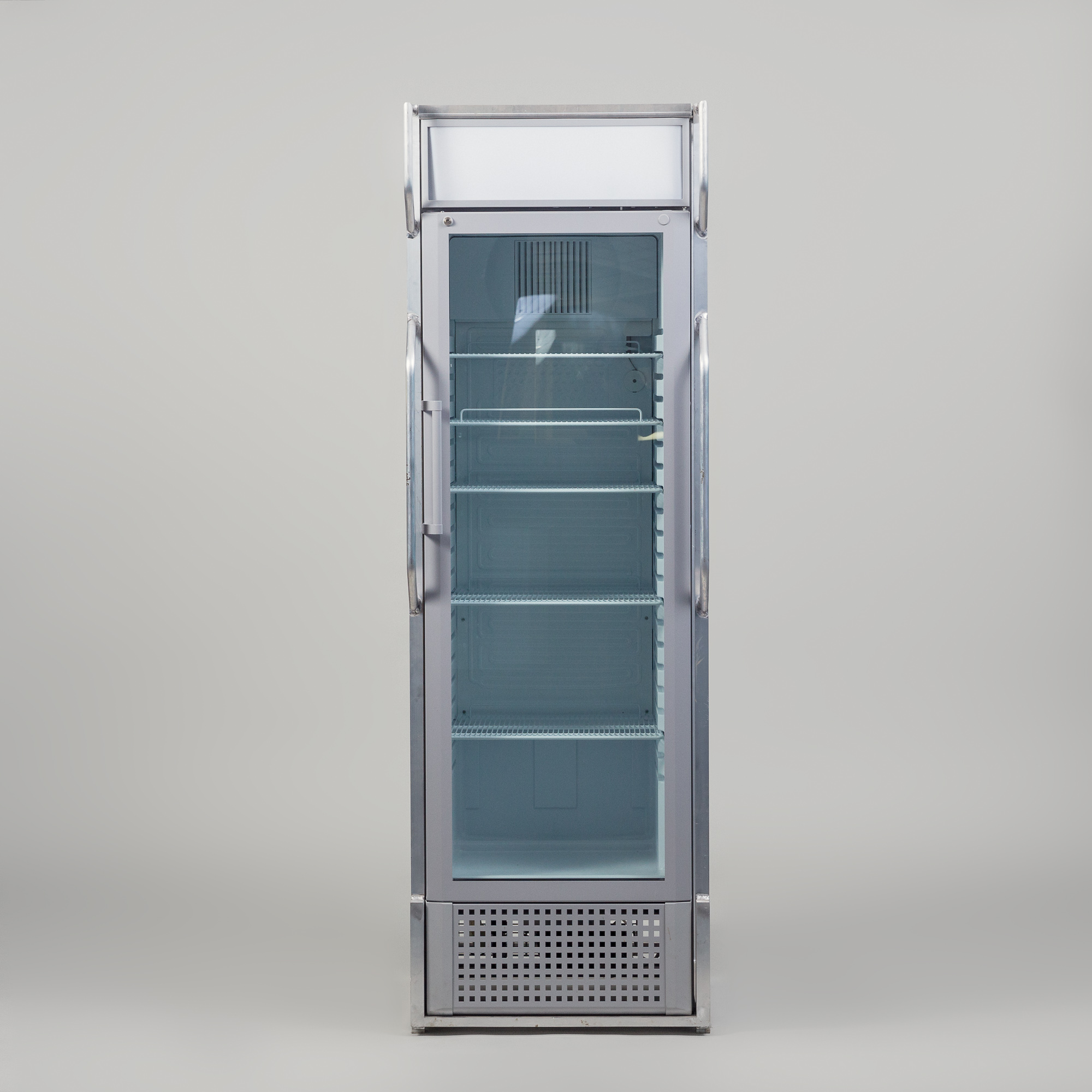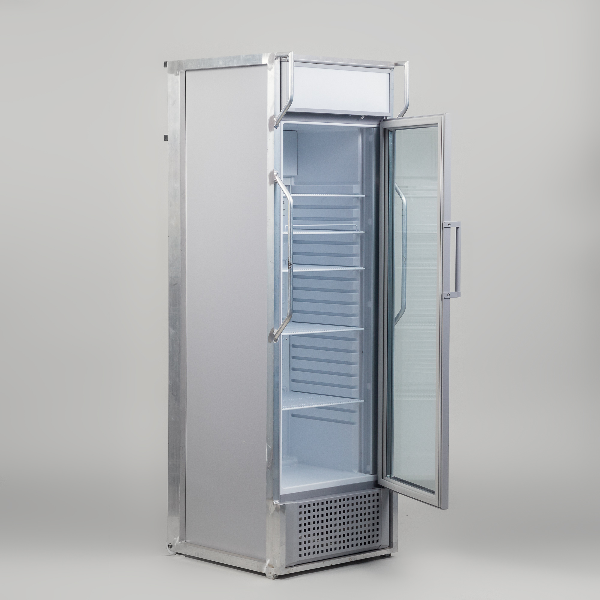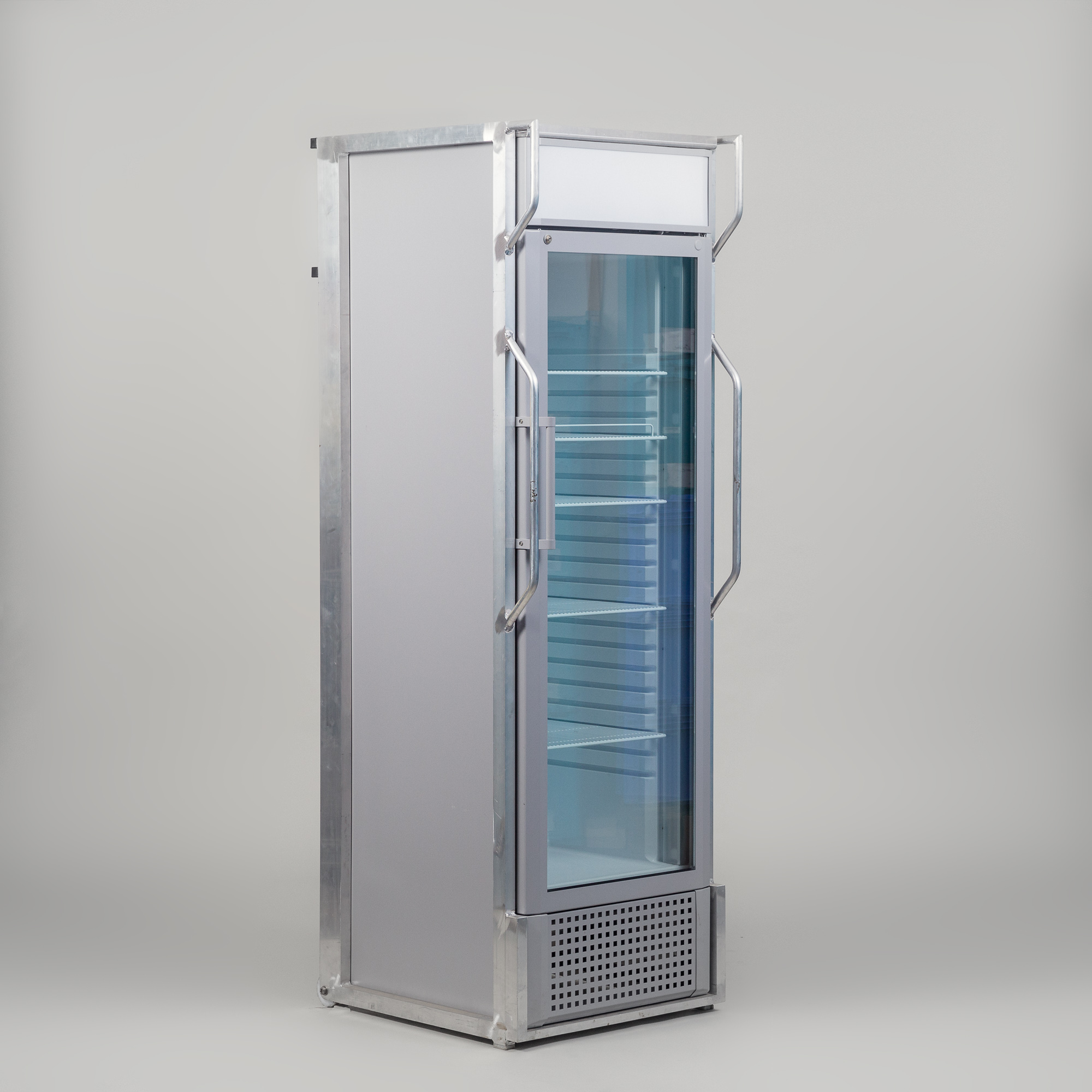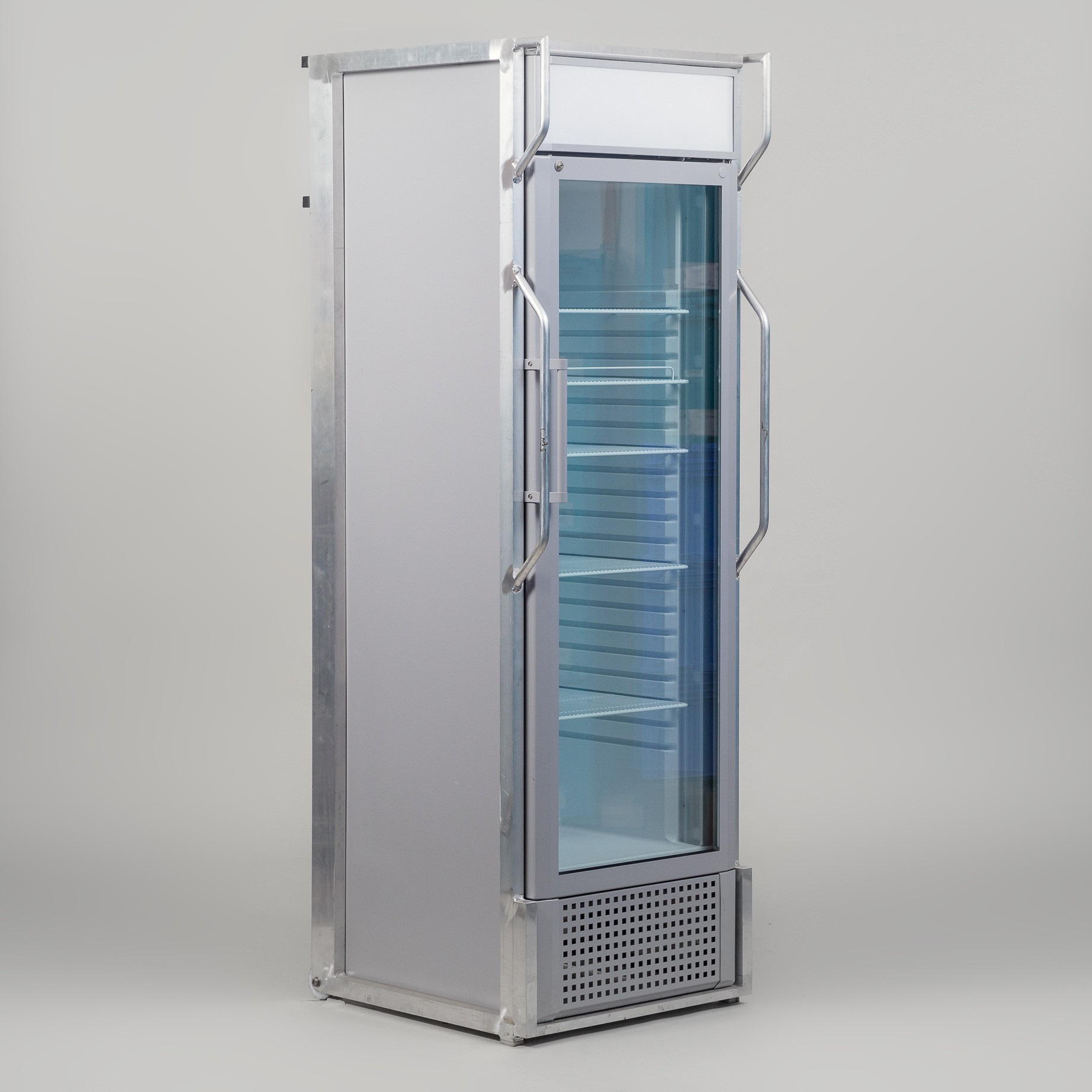 HxBxT: 2,00x0,60x0,70m; Volumen: 290l; Korpus lichtgrau; Front Glas; m. umlaufendem Aluminium-Schutzrahmen