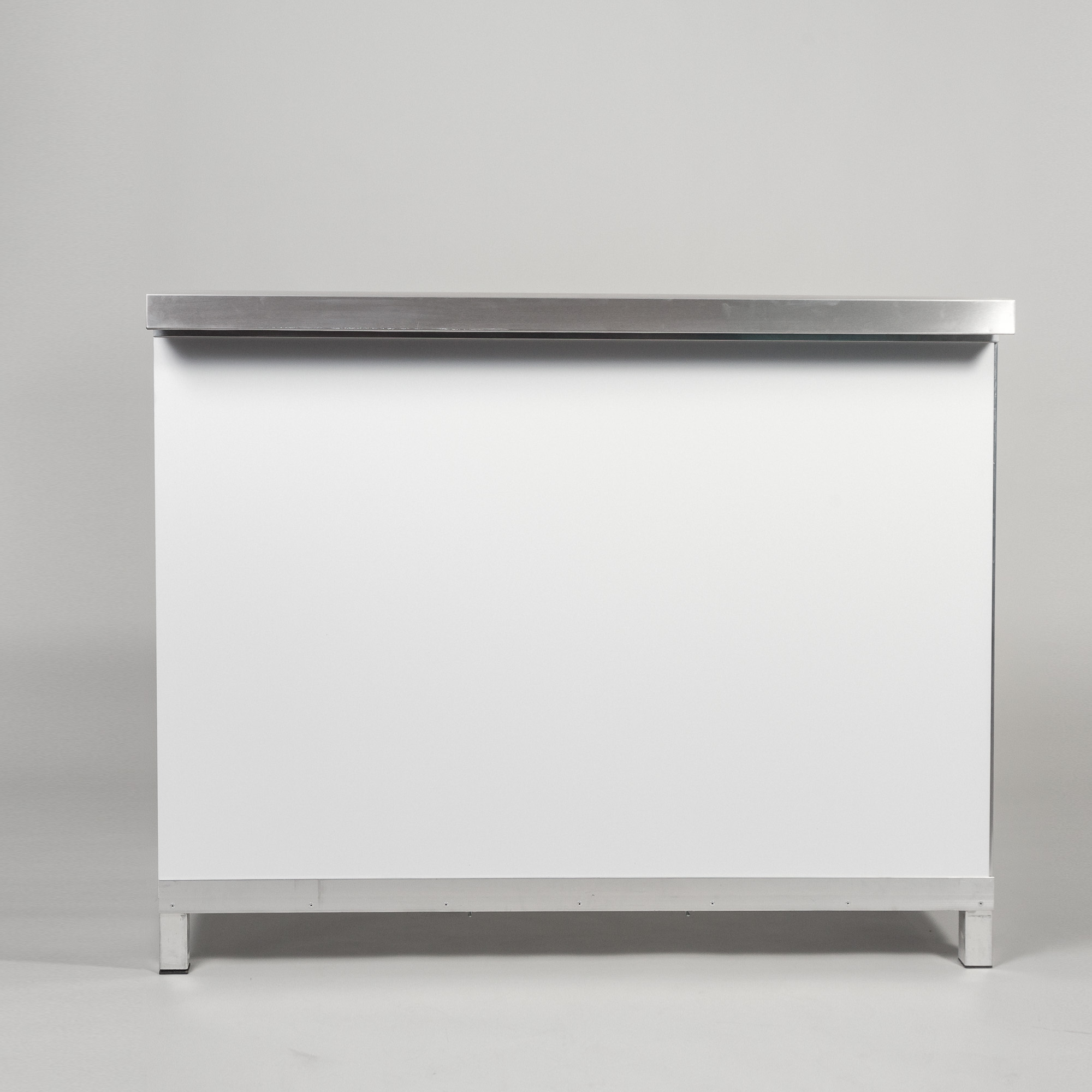 HxBxT: 1,18x1,49x0,61m; Front u. Seitenteile Etalbond weiß; Tresenbrett m. Edelstahlabdeckung; Arbeitsplatte wasserfeste Holzplatte dunkelbraun