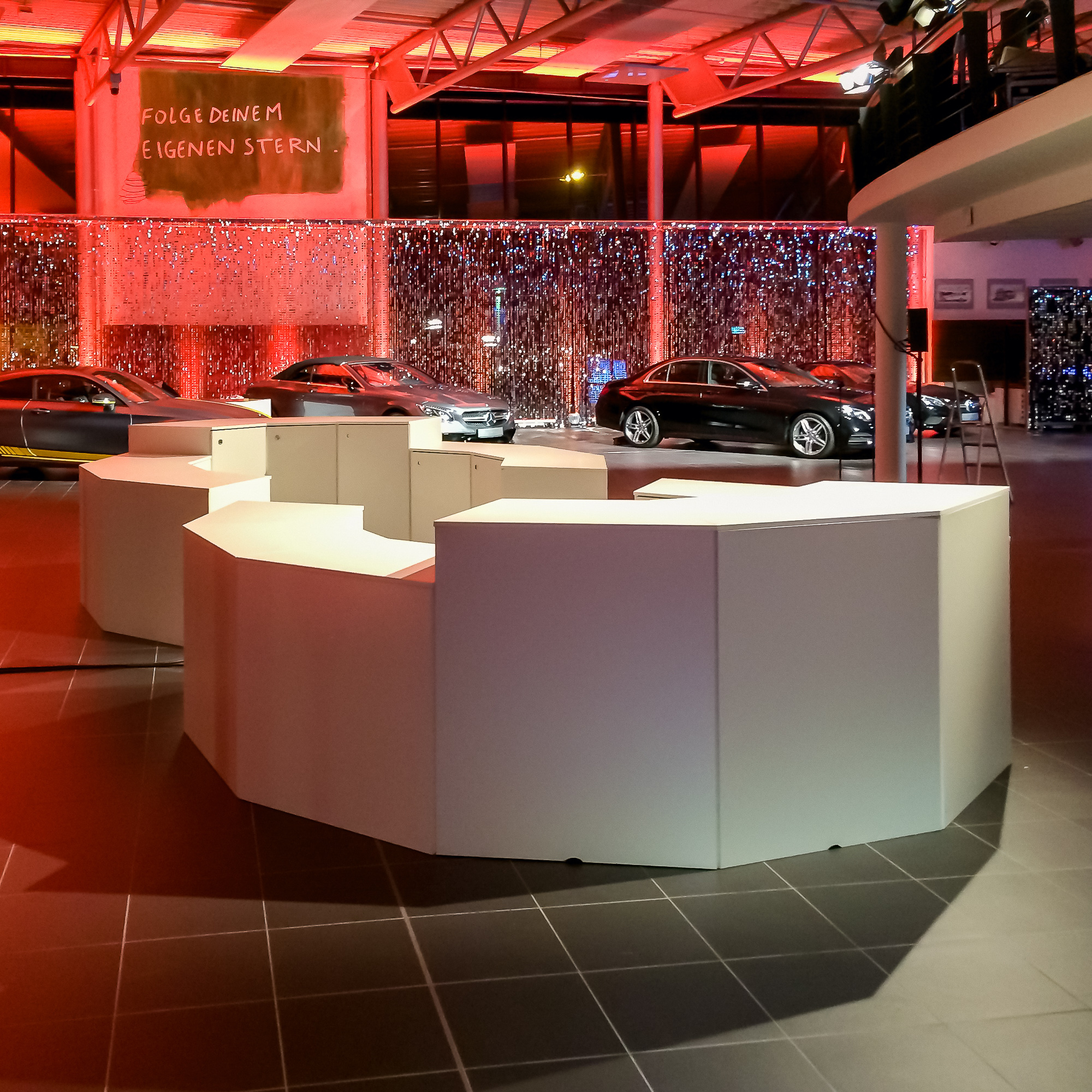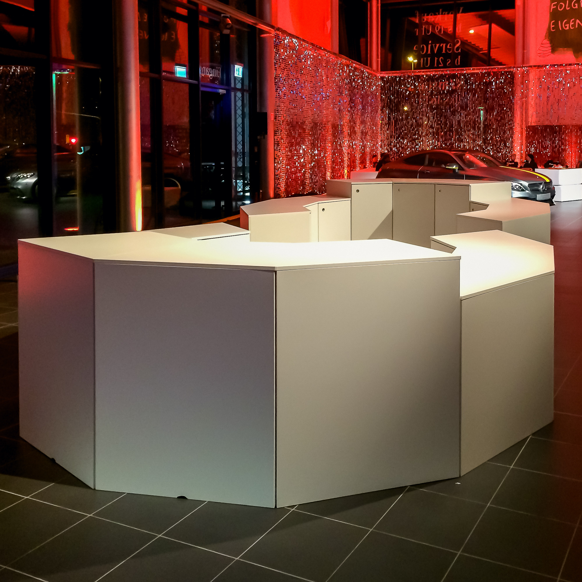 Beschreibung: | halbrunder Tresen, der als Bar oder Bufettfläche verwendet werden kann, die Grundversion besteht aus 5 Elementen in den frei wählbaren Höhen 90 oder 110 cm, das System kann beliebig erweitert werden |