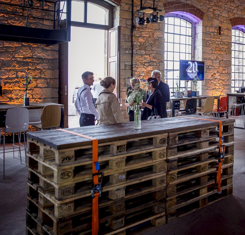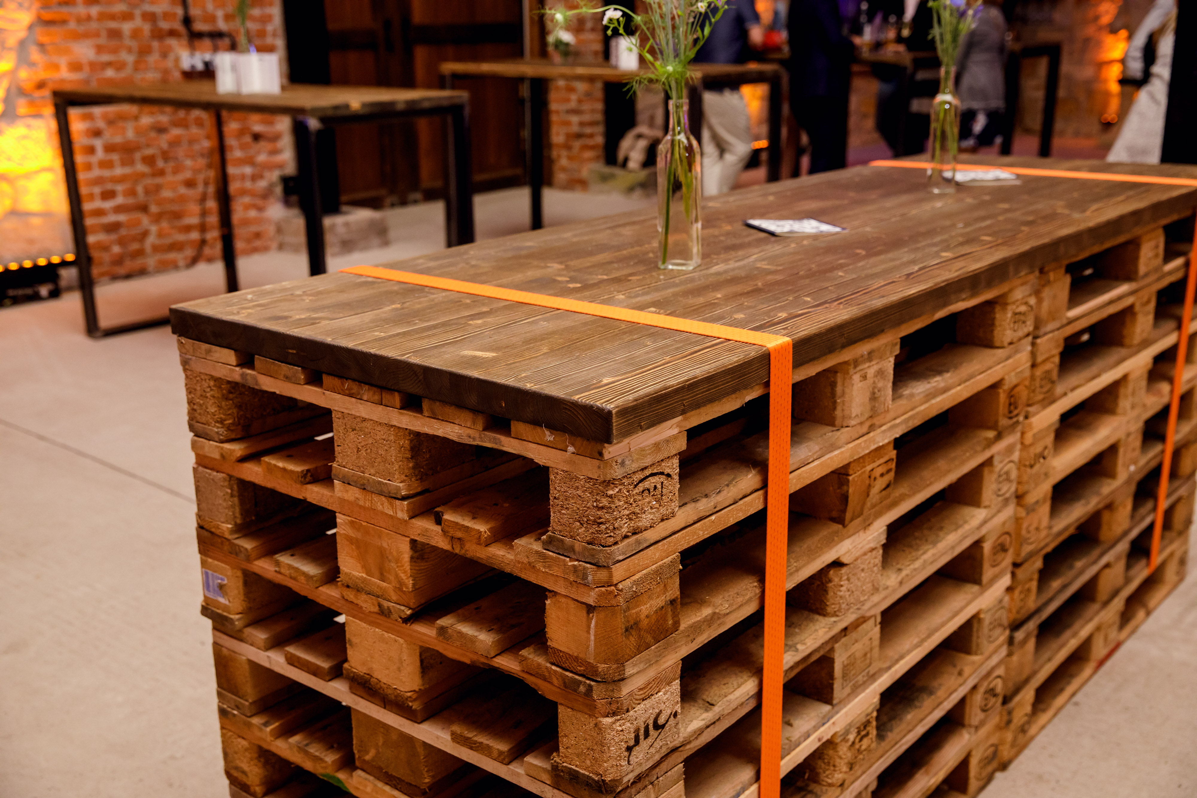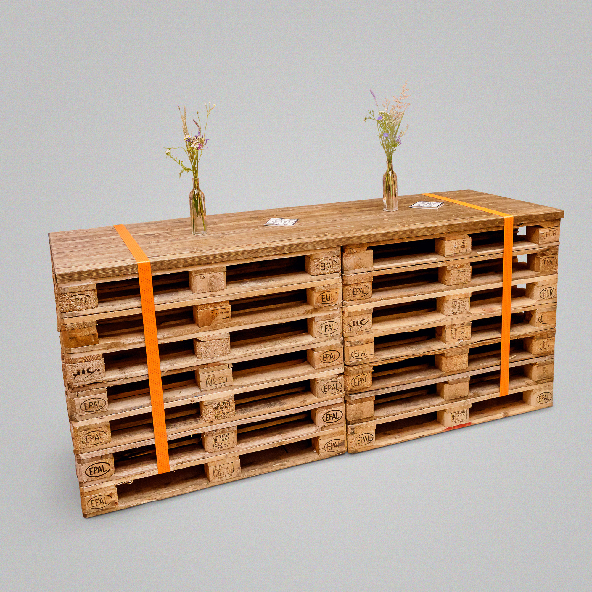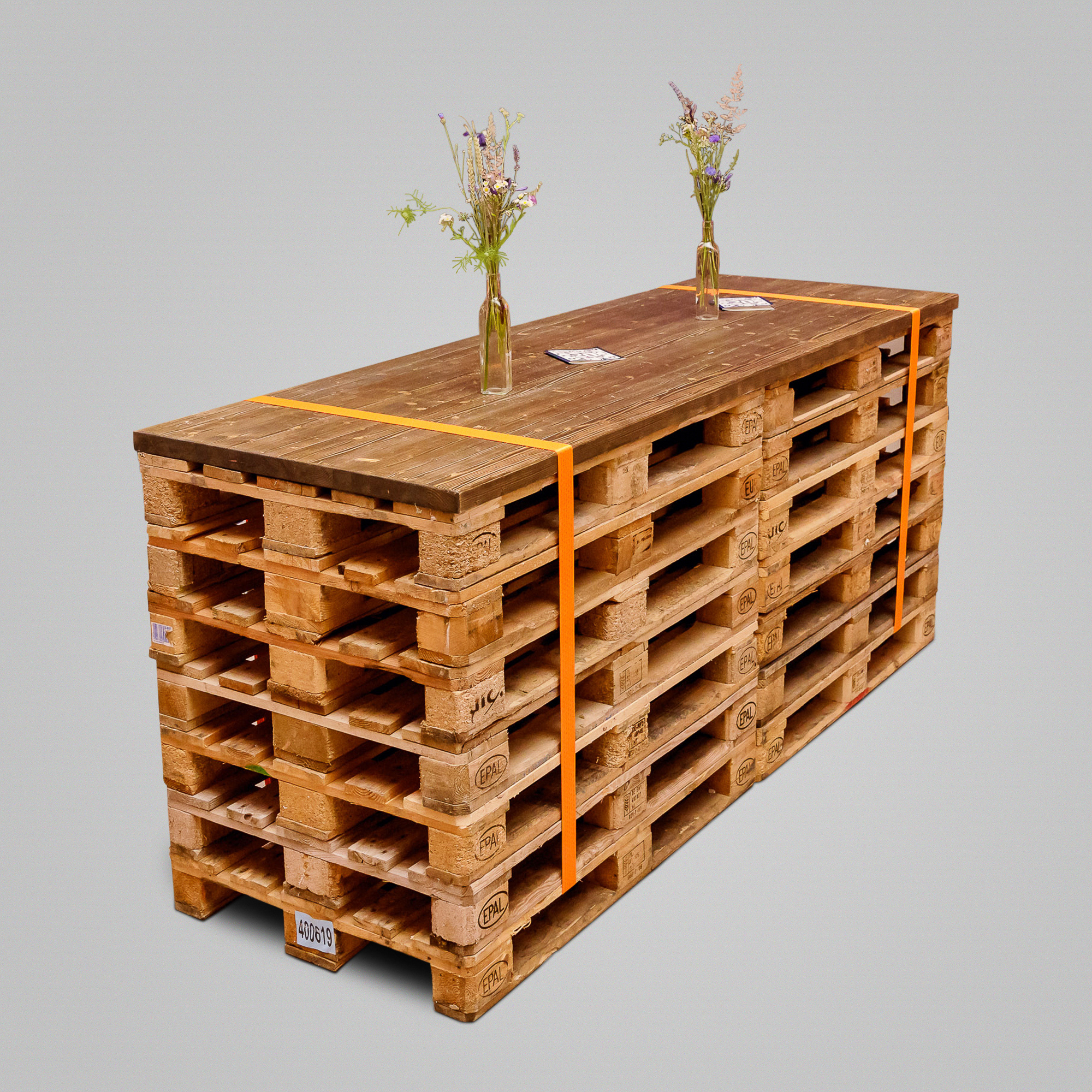 HxBxT: 1,10x2,40x0,80m; Tischplatte Echtholz; Gestell aus 14 Europaletten m. Ratschengurtfixierung