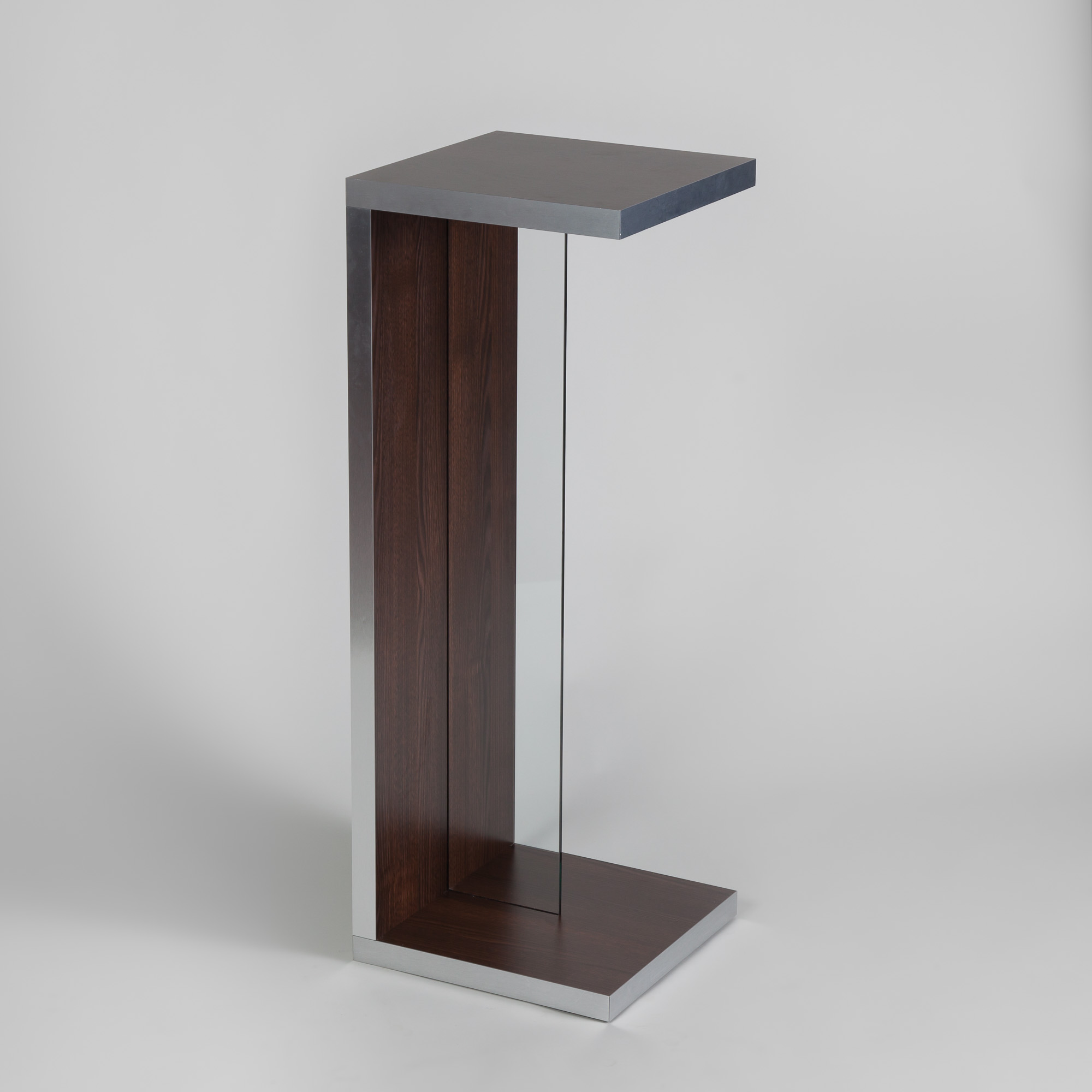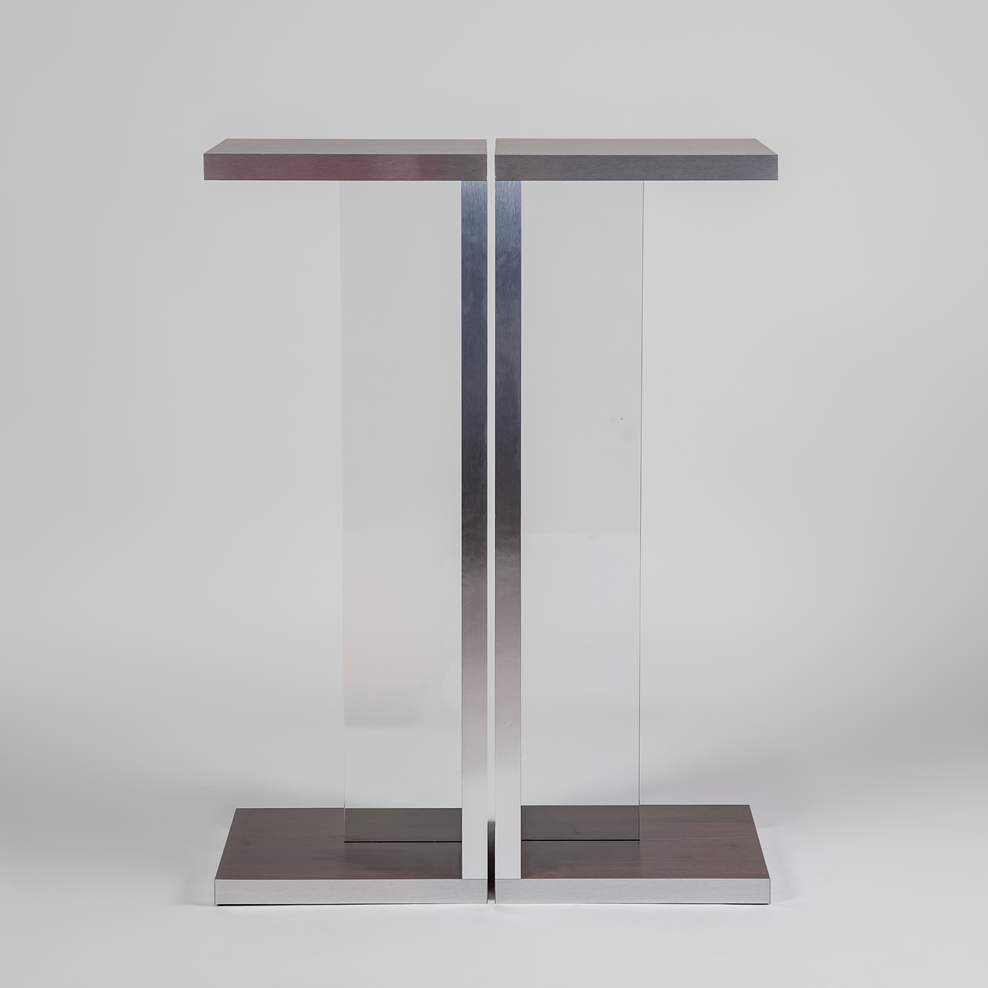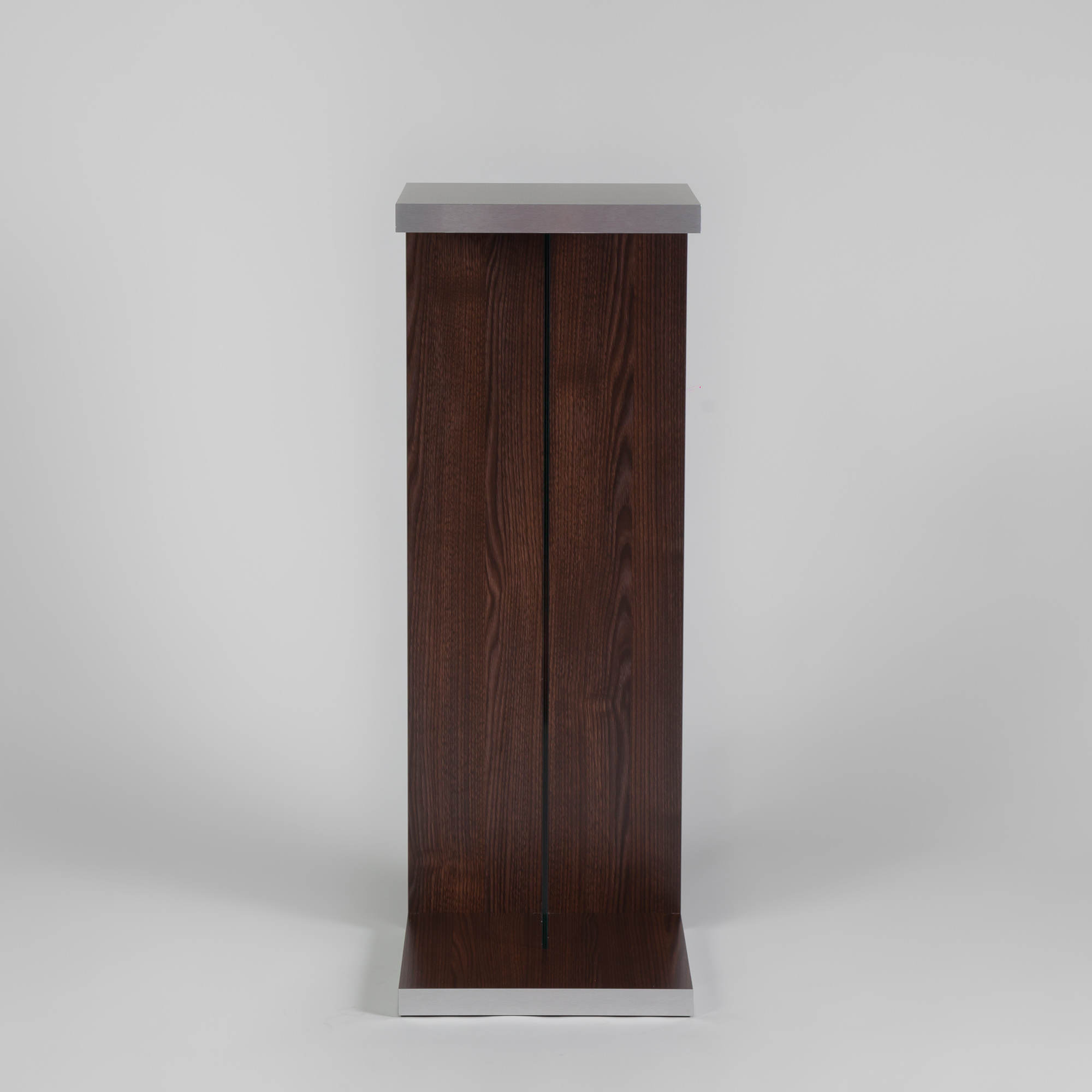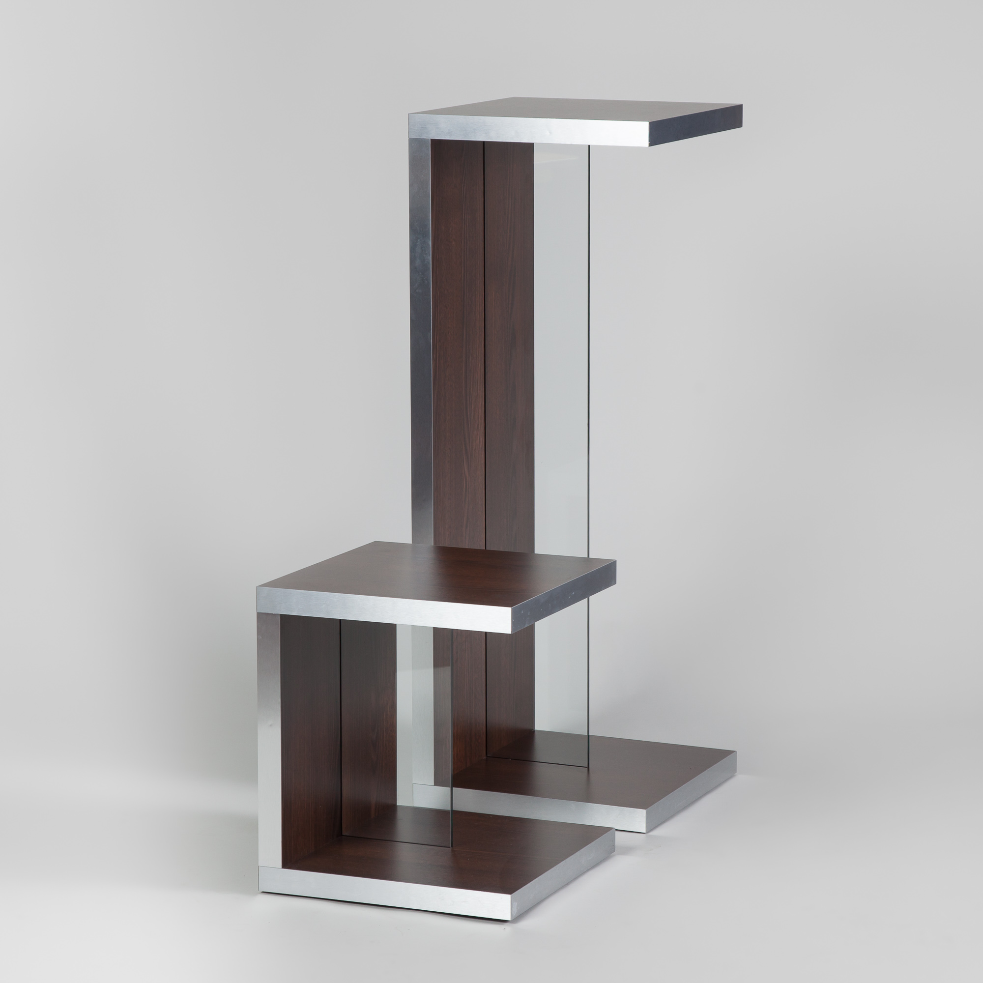HxBxT: 1,10x0,40x0,40m; Korpus Eiche dunkel mit Glaselement; Kante silber