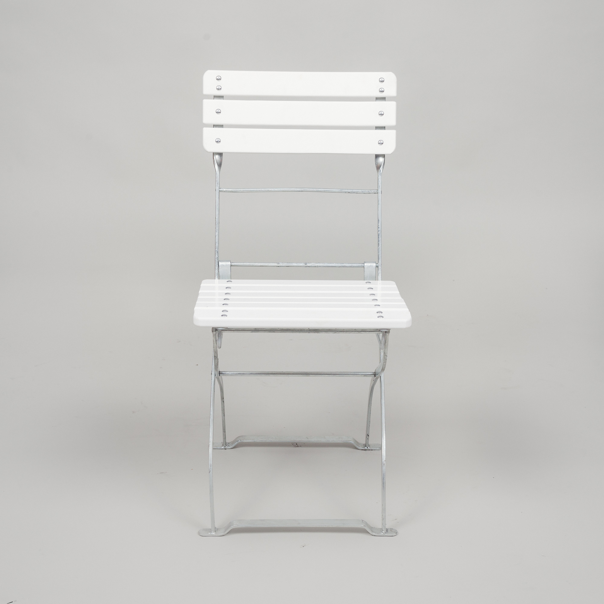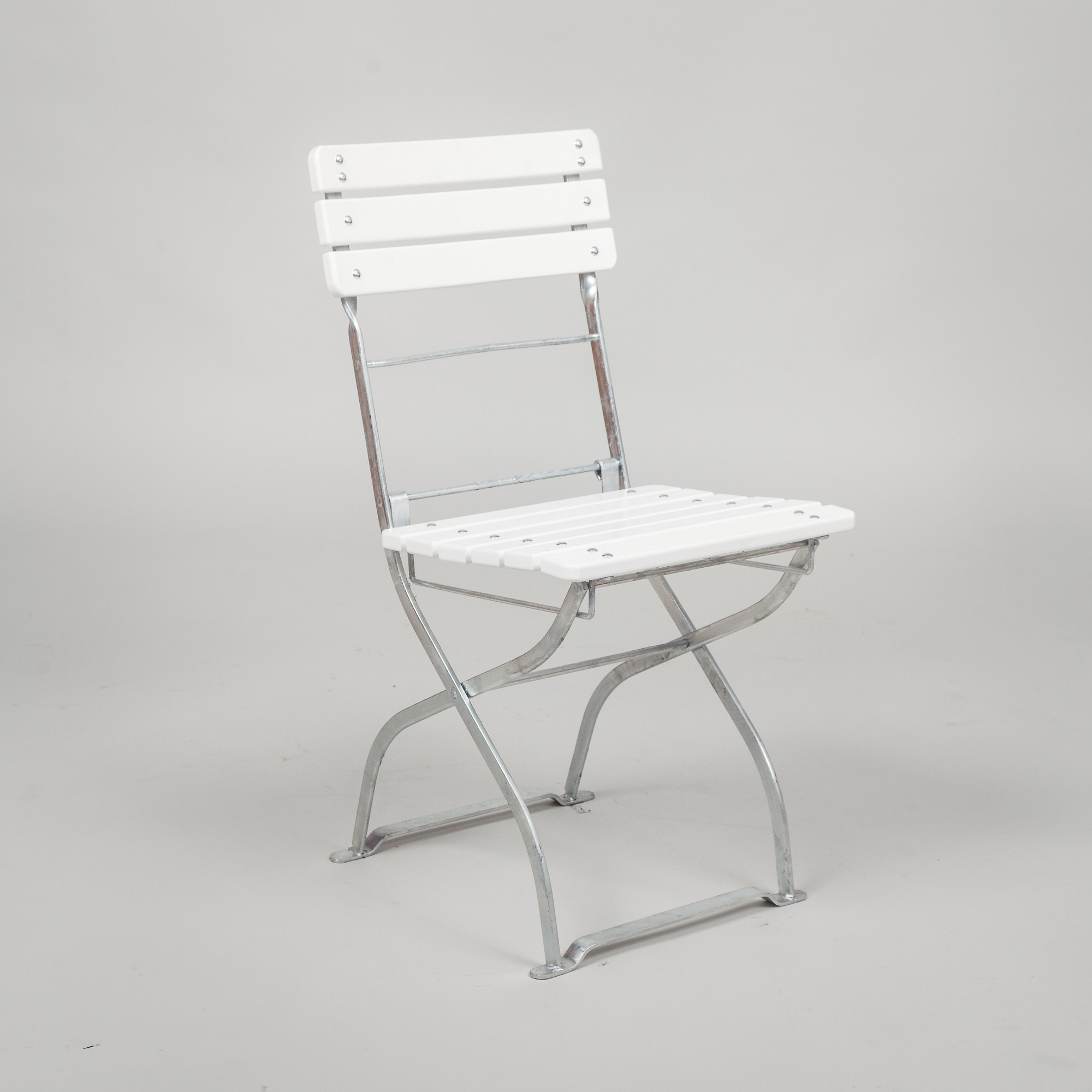 SHxB: 0,45x0,40m; Sitz u. Rückenlehne weiß; Gestell verzinkt, Stegfuß, klappbar