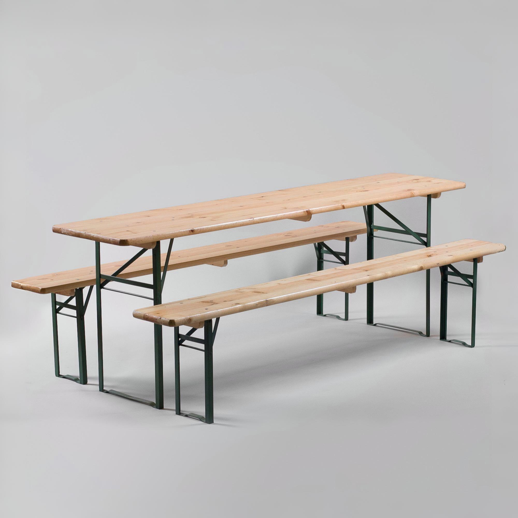 1 Festzelttisch u. 2 Festzeltbänke; Platte natur; Gestell grün, klappbar;
