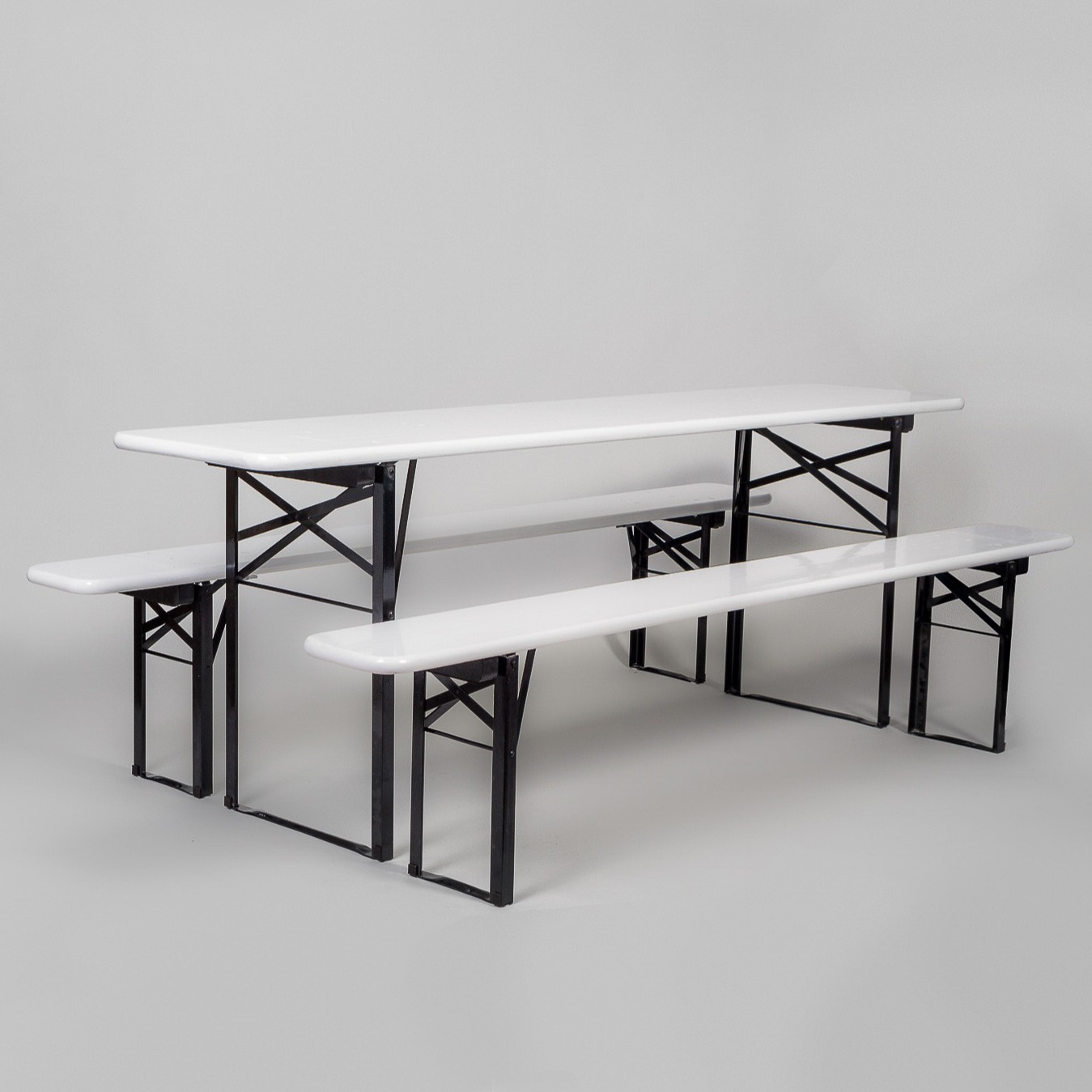 | Beschreibung: | weiße Festzeltgarnitur bestehend aus einem Tisch und zwei Bänken |